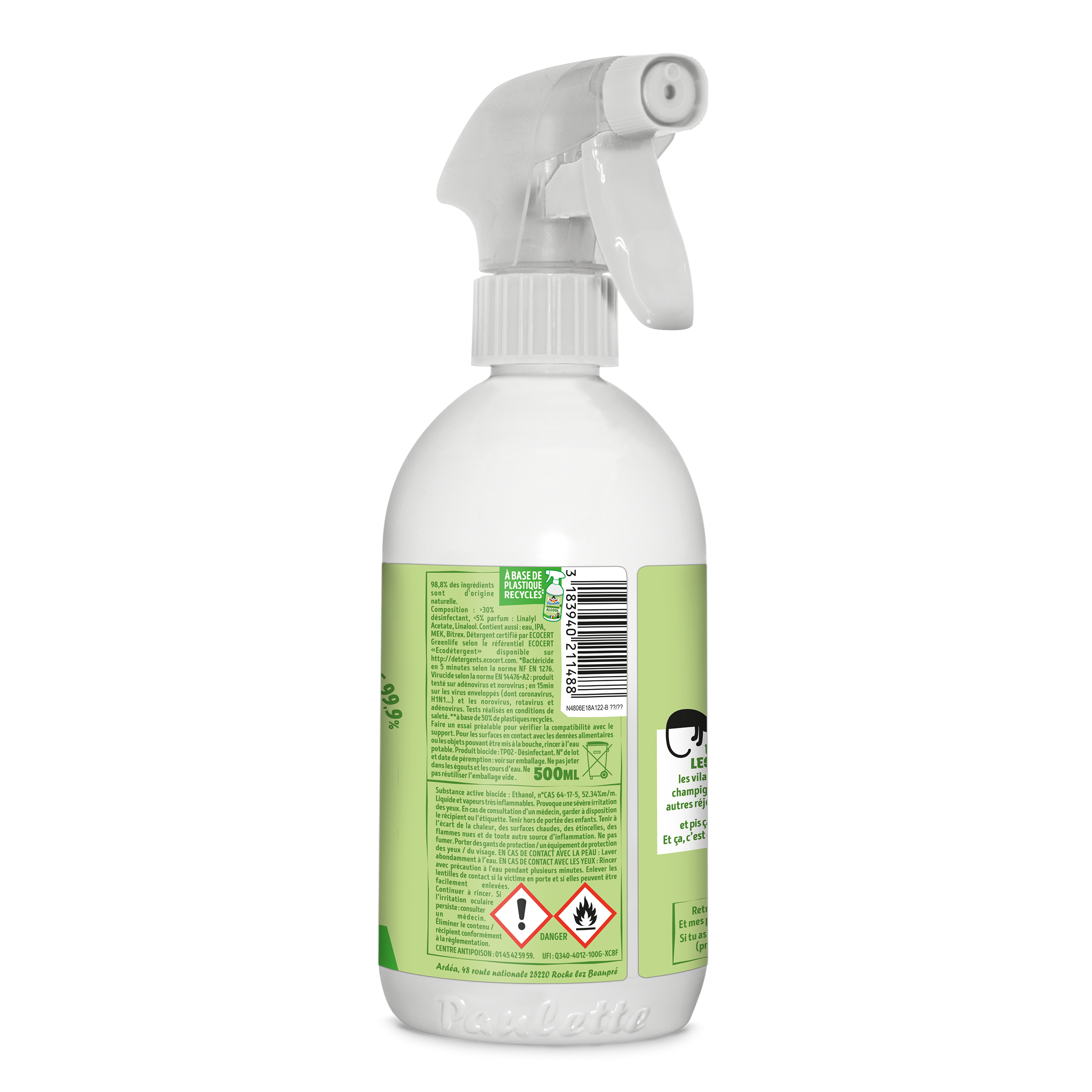 L’alcool est le produit ménager par excellence. Subtilement parfumé à l'eucalyptus, il embaume toute la maison d’une odeur fraîche. Facile à appliquer grâce à son spray, ce pulvérisateur 500 mL te permettra de nettoyer, désinfecter* et même dégraisser toutes les pièces de ton chez toi. Aucune surface ne lui résiste : meuble, bureau, vitre, tissu, écrans, matelas, marbre… et même ta voiture, ton four, lave-vaisselle, machine à laver, canapé en tissu, téléphone, tv, ordinateur…