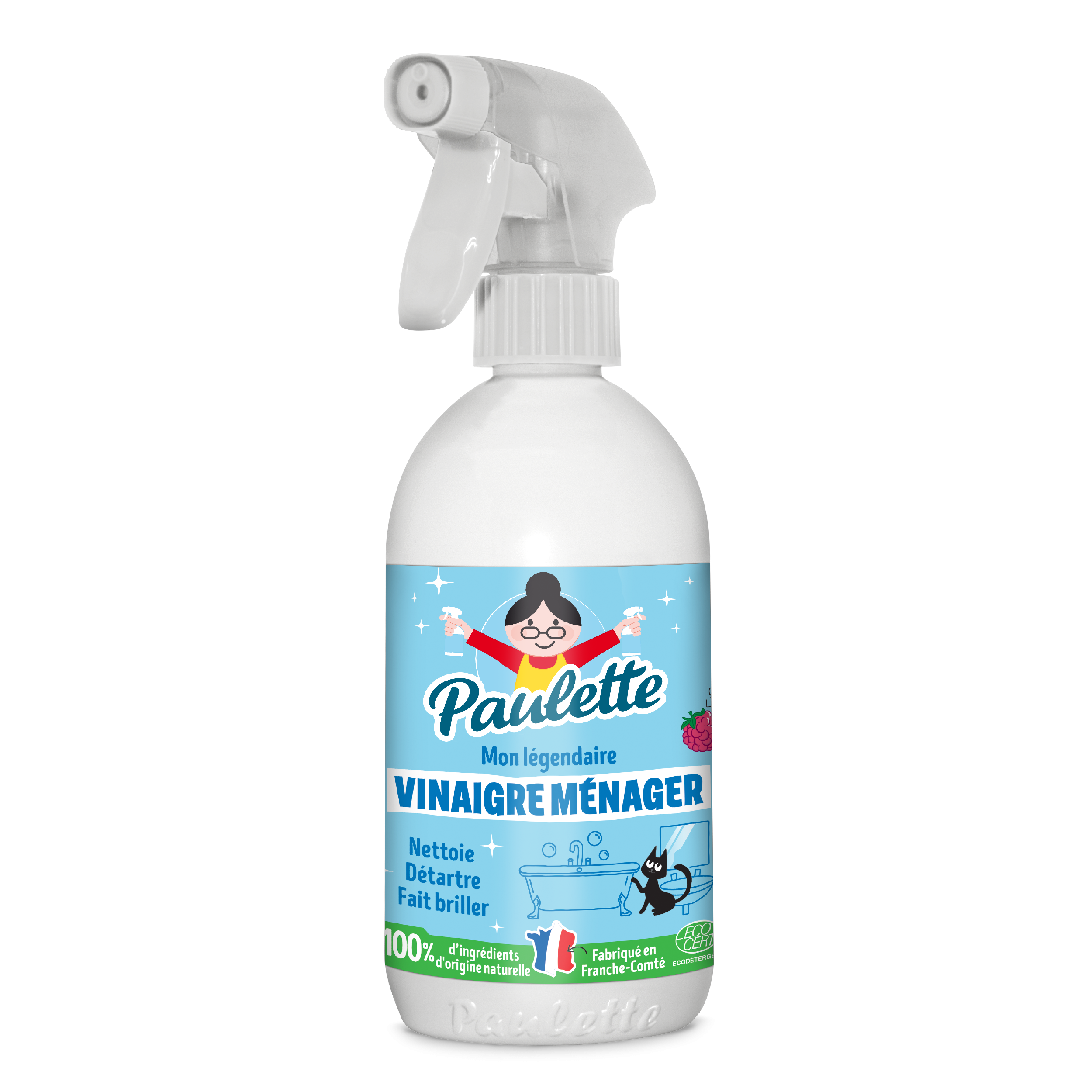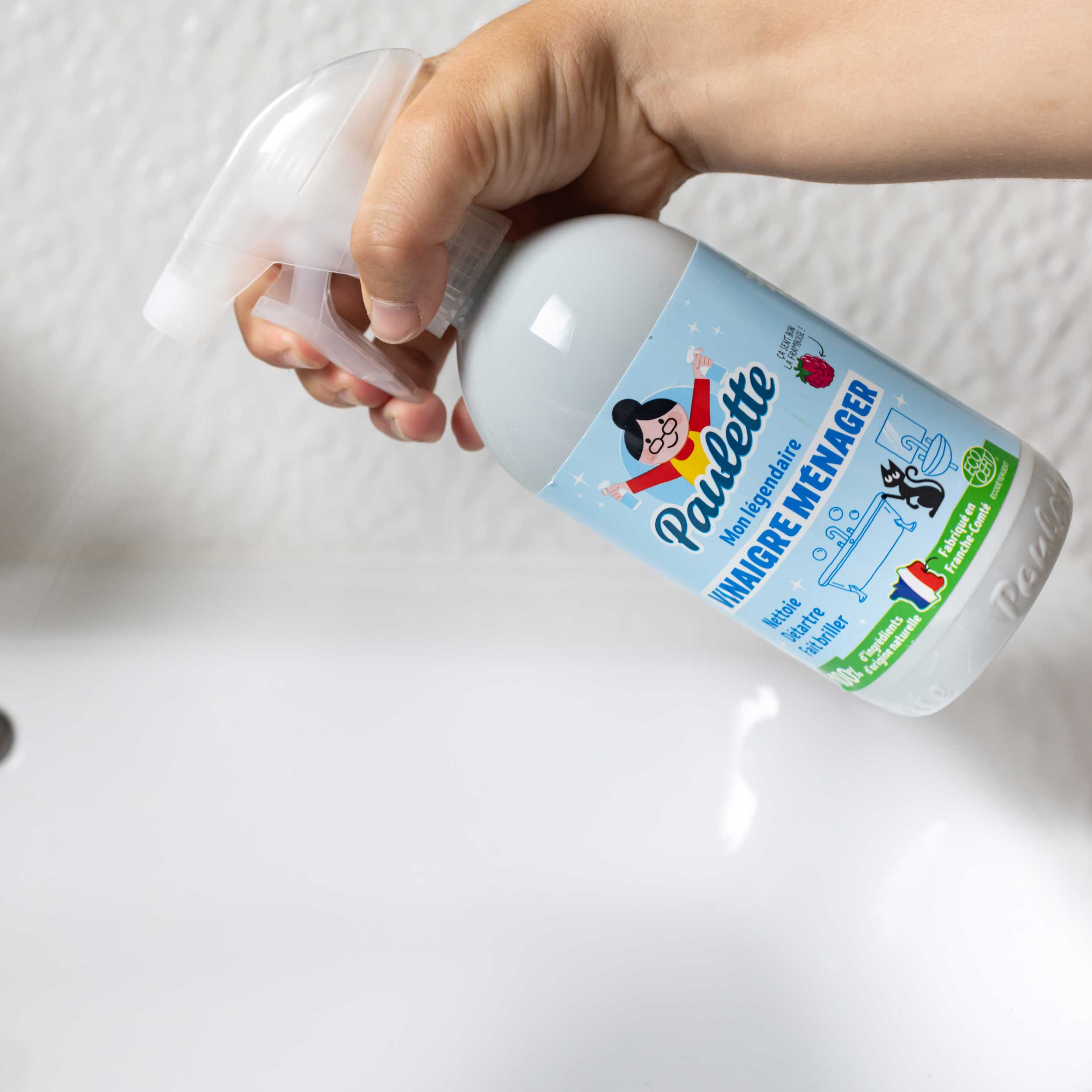 Avec son vinaigre framboise en pulvérisateur, Paulette t’en met plein les mirettes. Enfin pas du vinaigre hein ! Son pulvé super pratique permet d’appliquer la juste dose au bon endroit et de faire la guerre au calcaire partout où il se dépose dans ta maison.