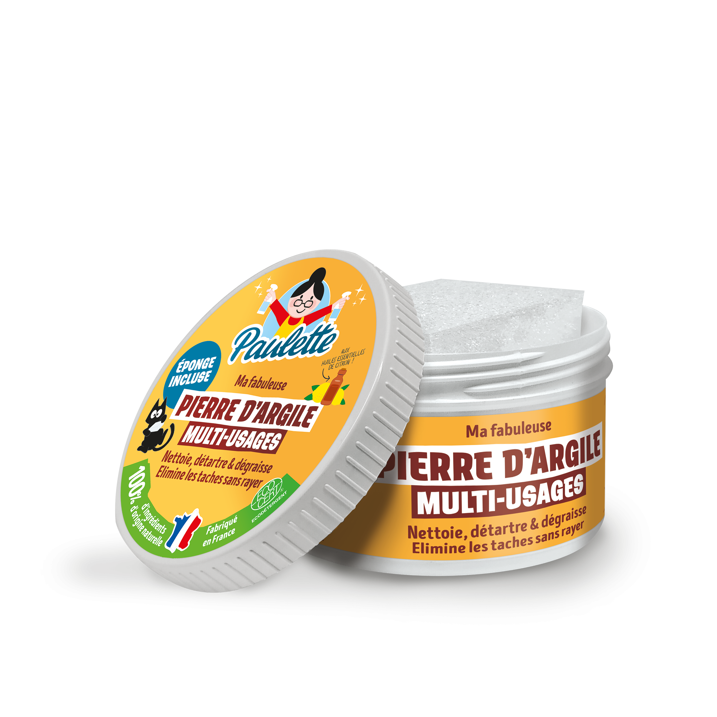 À base d'argile, la pierre multi-usages de Paulette est le super-héros de la propreté ! Elle nettoie, dégraisse, détartre, et fait briller toutes les surfaces sans faire de chichis ni de vilaines rayures. Adieu taches et traces en tout genre, bonjour éclat ! Plus durable qu'un super-héros en Spandex, fais donc des économies considérables et dis adieu au gaspillage !