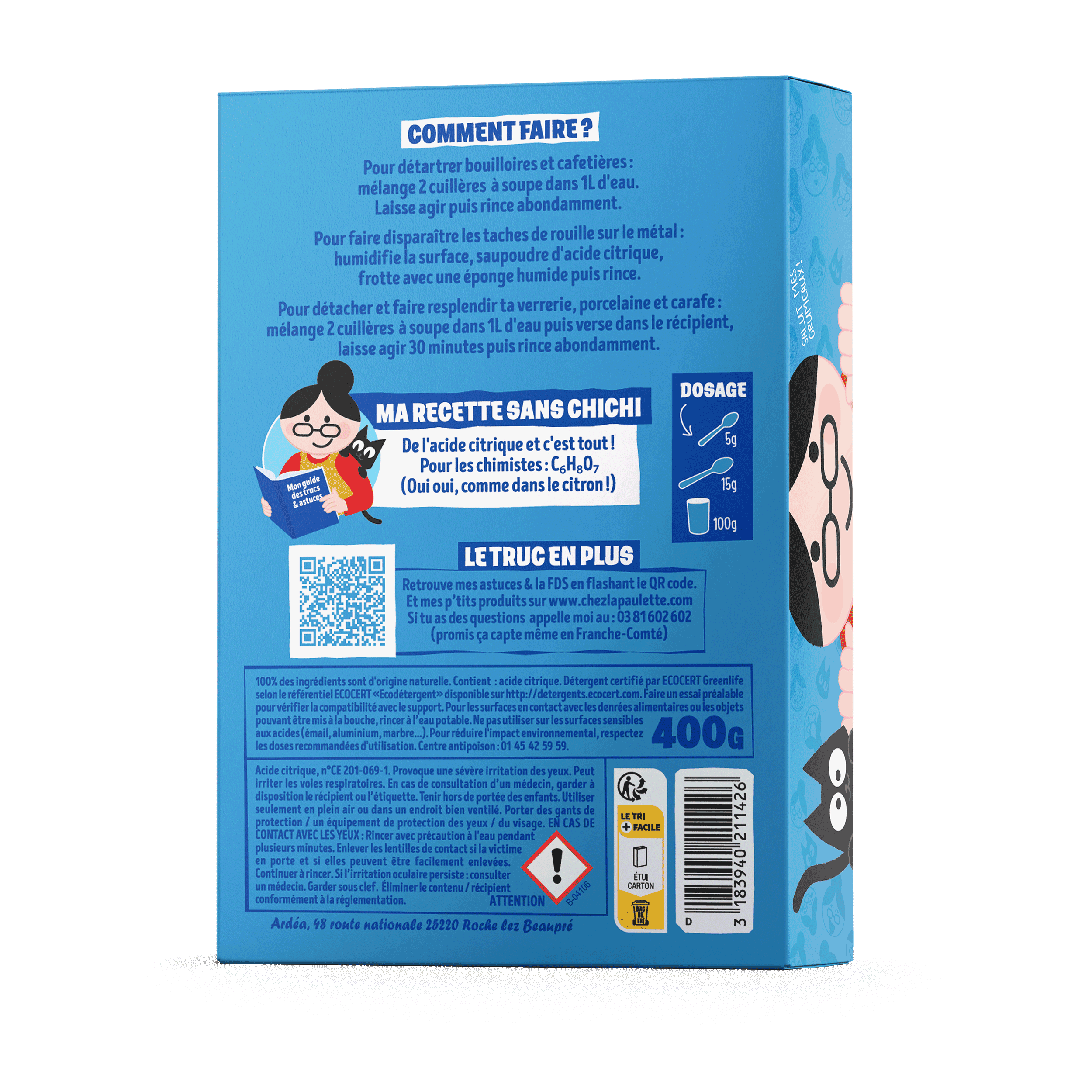 Avec l’Acide citrique en poudre de Paulette, certifié Ecocert et conditionné en France, tu peux dire adieu au calcaire et aux traces de rouille même les plus tenaces ! 100% authentique, la saleté ne sera plus qu’un mauvais souvenir avec cet ingrédient génial. Nettoie, détartre et débarrasse-toi des traces mêmes les plus incrustées en toute simplicité, grâce au format shaker ultra pratique.