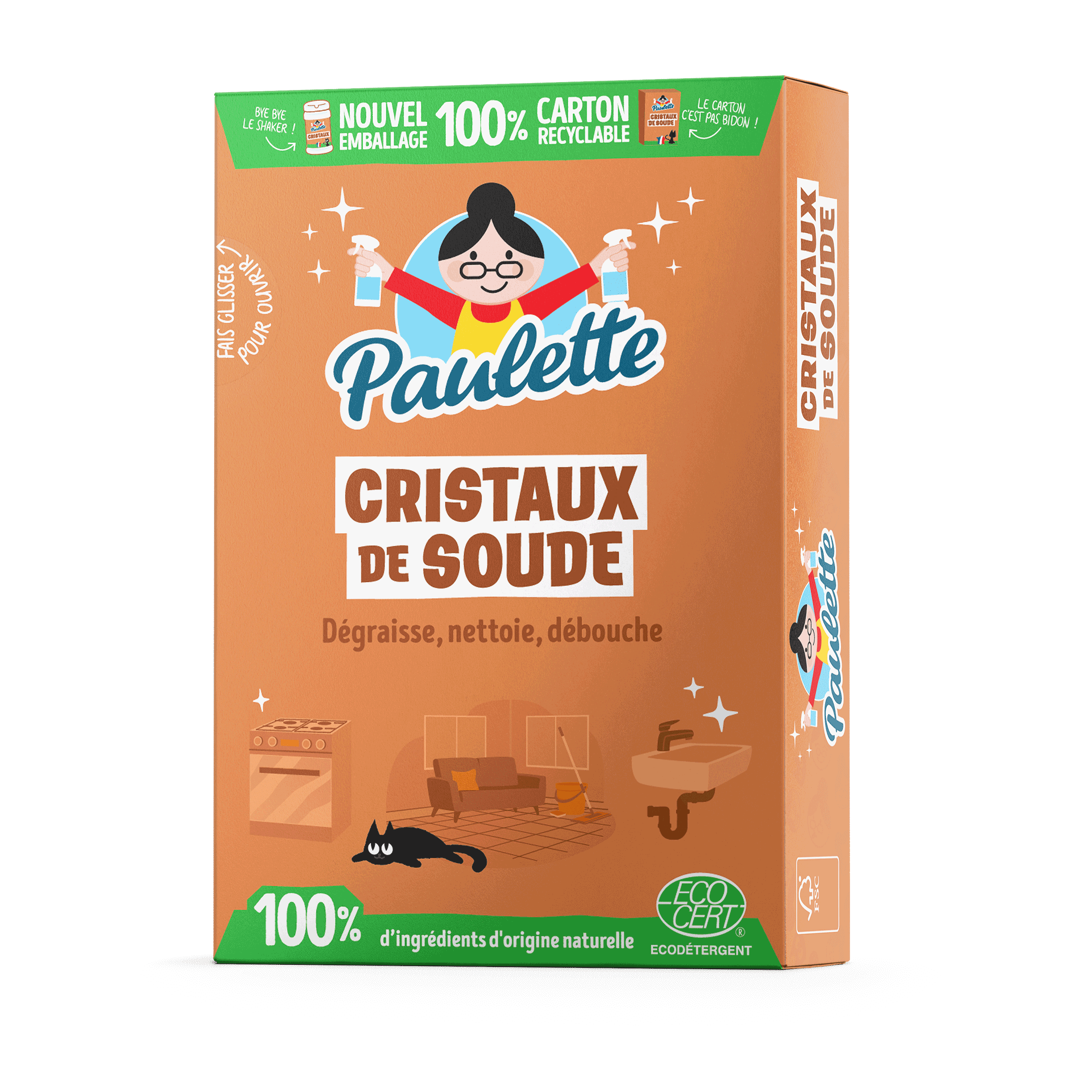 Certifié Ecocert, conditionné en France et authentique, c’est l’ingrédient qui fera de ton ménage une partie de plaisir. Et pour encore plus de confort et un impact minimum sur l’environnement, un format boite en carton 100% recyclable : Paulette a pensé à tout ! Pour l’ouvrir ou le fermer c’est fastoche, tu fais glisser la languette prédécoupée. Il est pratique, il est mignon et grâce à son format il se glissera discrètement dans ton placard, sans prendre trop de place.