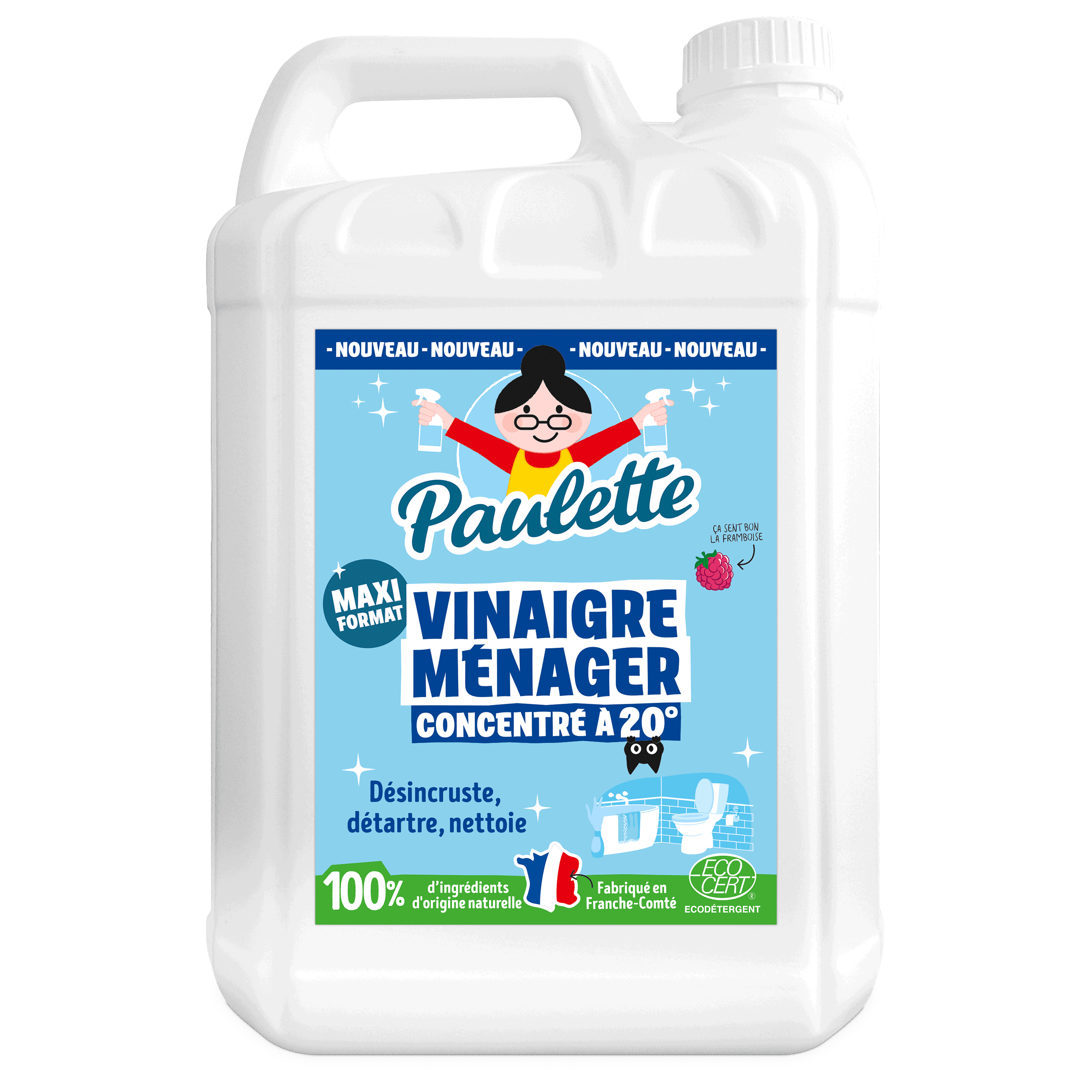 Avec sa formule concentrée à 20°, ce vinaigre ne laisse aucune chance au tartre ! Il nettoie, détartre et fait briller toute la maison, tout en laissant un léger parfum de framboise. Et parce que Paulette pense aussi à ton porte-monnaie, elle t’a concocté un format 5L : plus économique, plus pratique, et toujours aussi efficace.